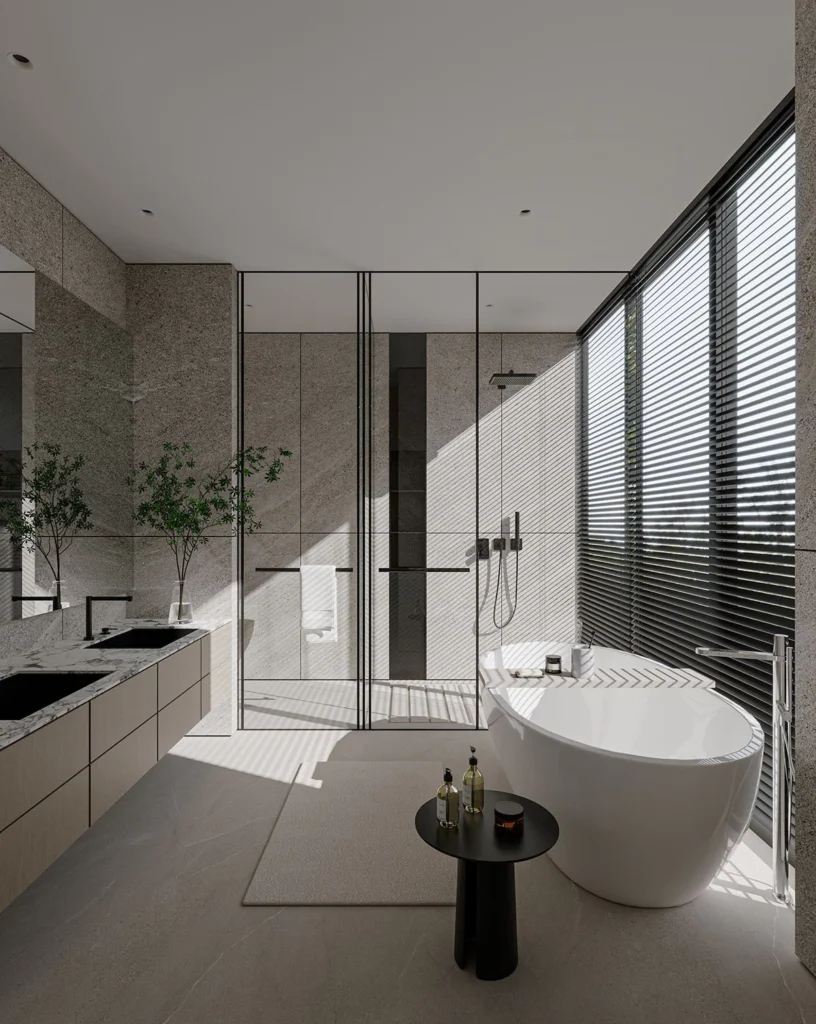 Suitable materials can make a place look classy and make it last longer. Large-format tiles are perfect for reducing grout lines and giving your surface a clean and smooth look. Micro cement gives a fresh and simple feel, while natural stone gives a refined and classic look. Go for waterproof, durable, easy-going, and cool-looking surfaces.