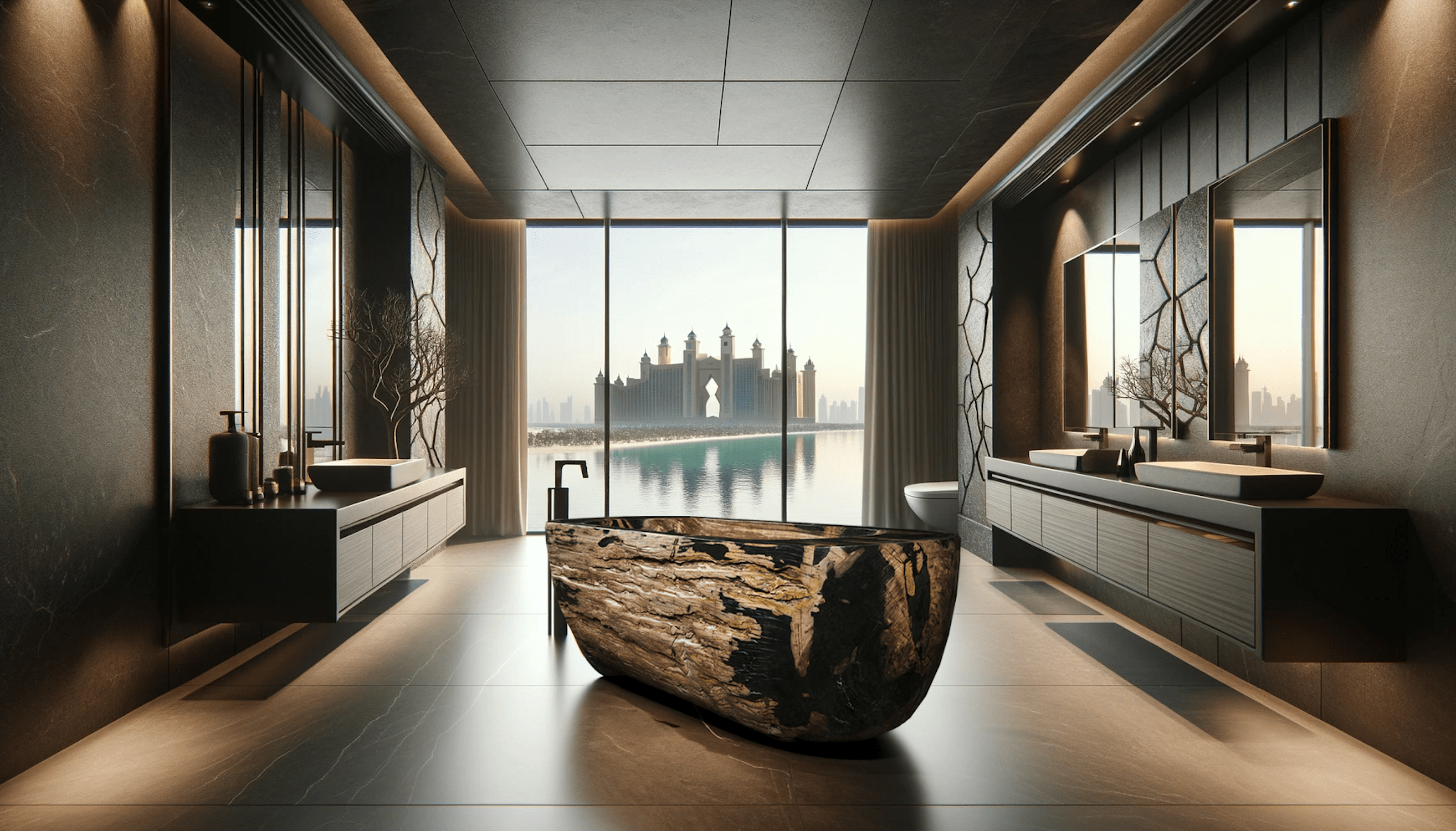 Carved from mineralized Jurassic timber, this petrified wood bathtub transforms bathing into paleontological immersion. Its organic contours preserve 200-million-year-old growth rings, now reinforced with quartz and jasper veins that shimmer underwater. The silica-rich surface naturally inhibits bacterial growth while maintaining a wood-like warmth against skin—a paradox of stone’s durability and timber’s tactile comfort.