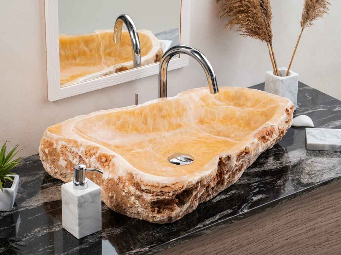 A freestanding basin carved from stones like Blue Apatite or Zebra Rock. Its organic contours and mineral shimmer turn daily routines into sensory experiences, compatible with smart faucets.