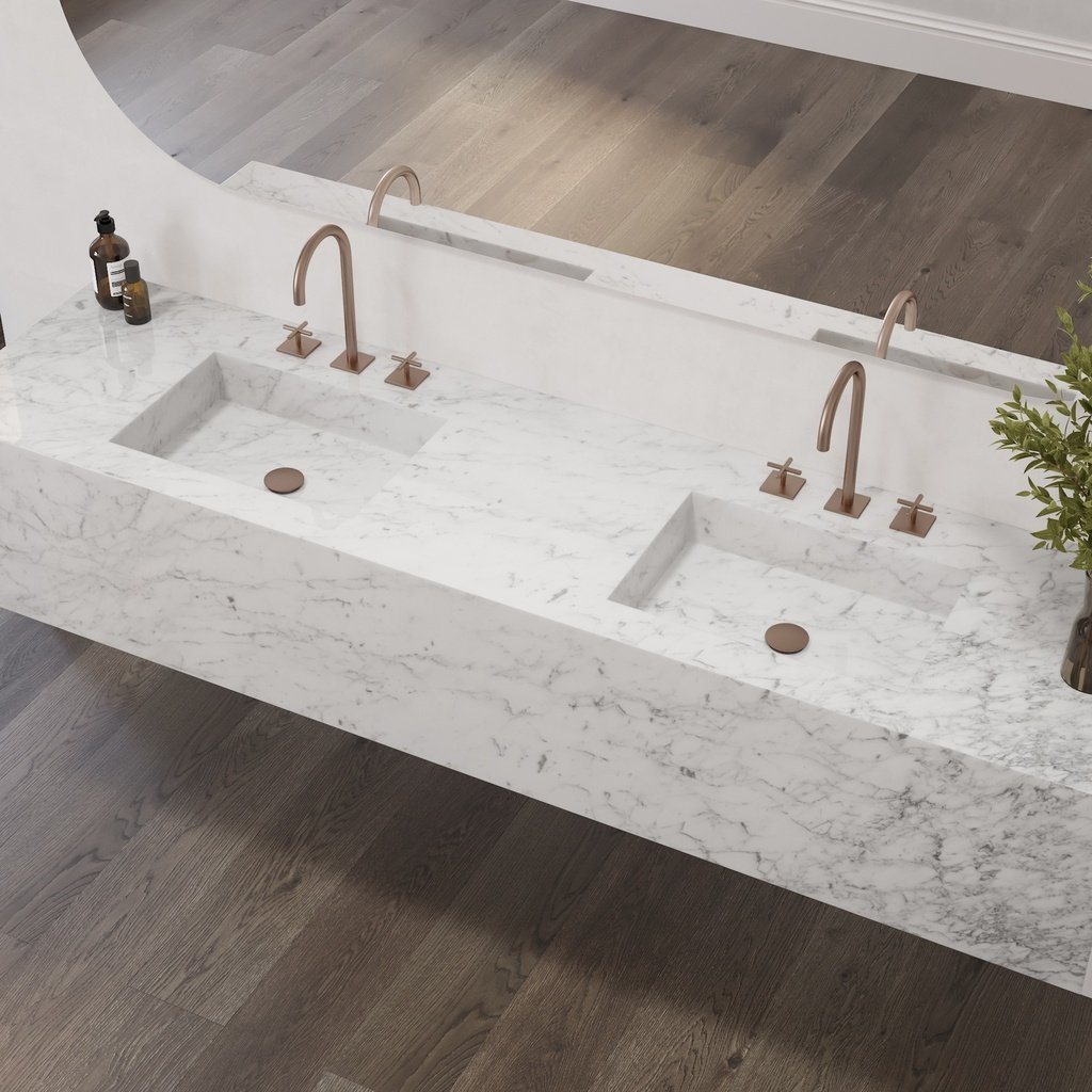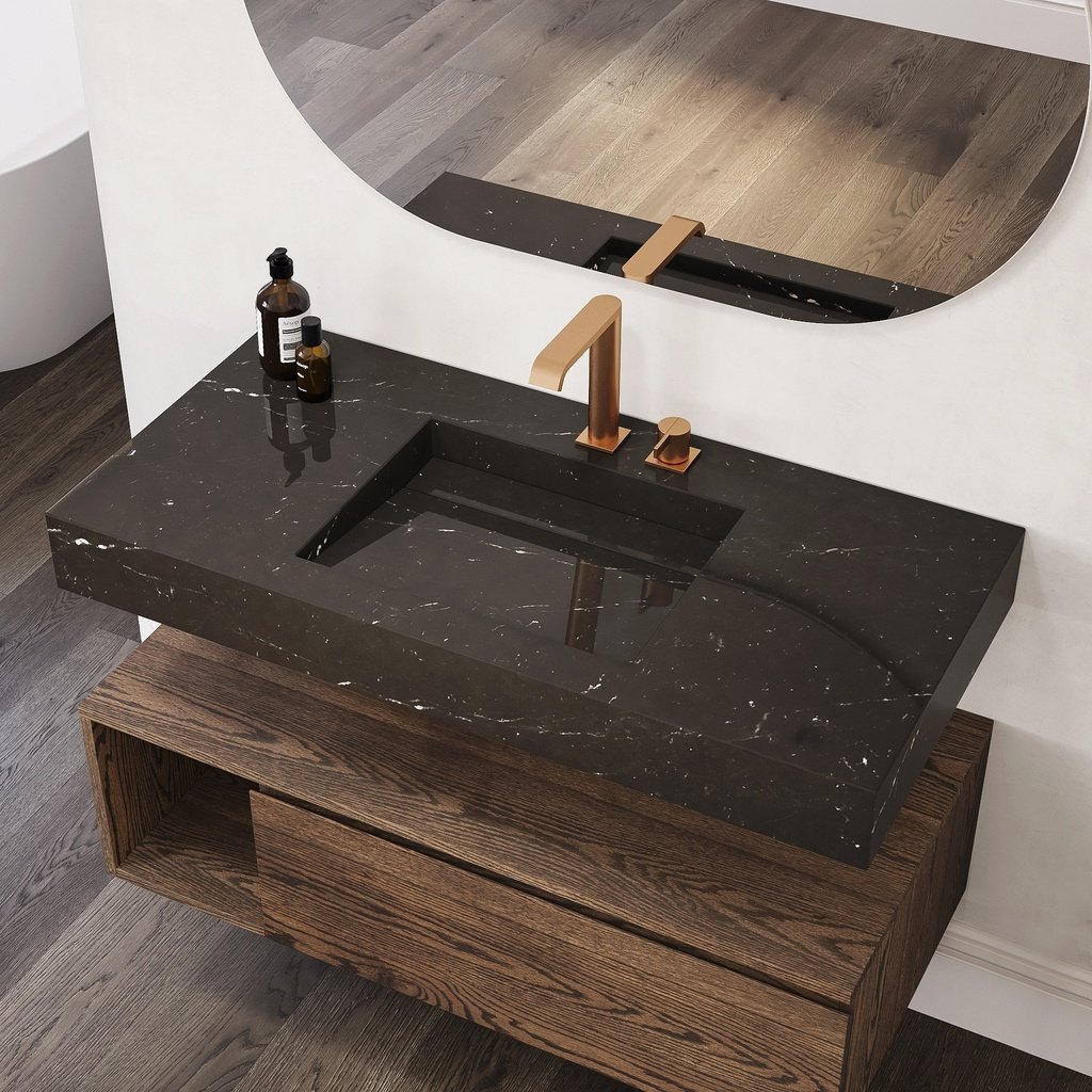 A marble vanity adds luxury to bathrooms with its seamless integration of sink and countertop. Waterproof and hygienic, it simplifies daily routines while exuding spa-like tranquility. Configure with undermount sinks or floating designs.